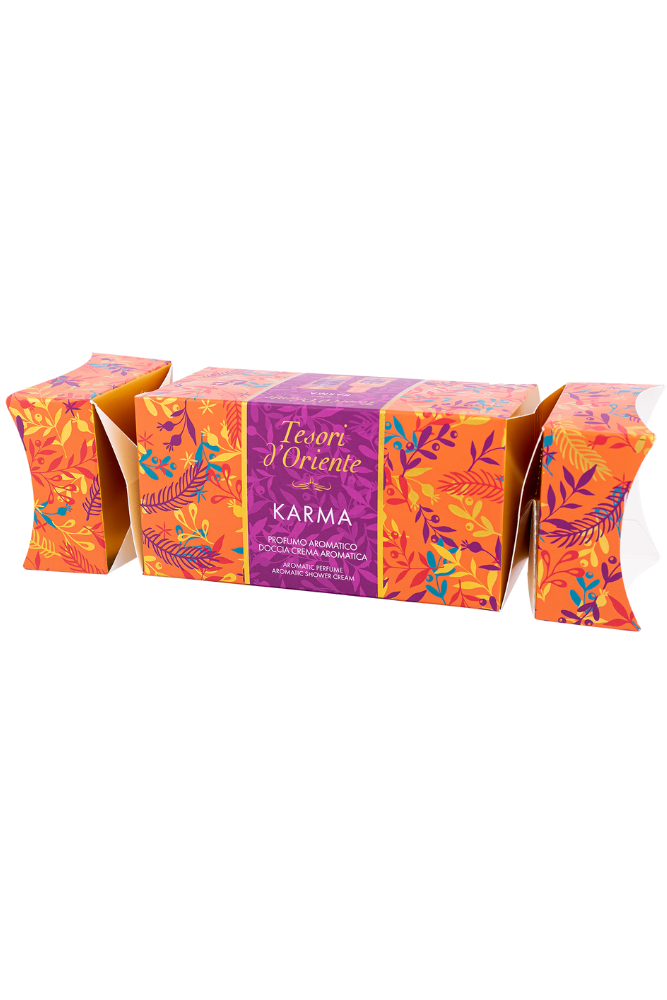 Tesori d’Oriente „Cukierek” Karma to wyjątkowy zestaw prezentowy inspirowany ideą wewnętrznej równowagi i spokoju. Jego ciepły, orientalny zapach otula ciało zmysłową elegancją, tworząc atmosferę wyciszenia, harmonii i przyjemnego odprężenia. To aromat, który sprzyja relaksowi i zamienia codzienną pielęgnację w mały rytuał dla ciała i zmysłów.